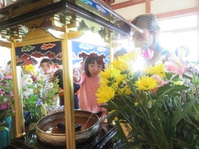 お花をお供えして、花畑のような花御堂にいらっしゃるお釈迦様に